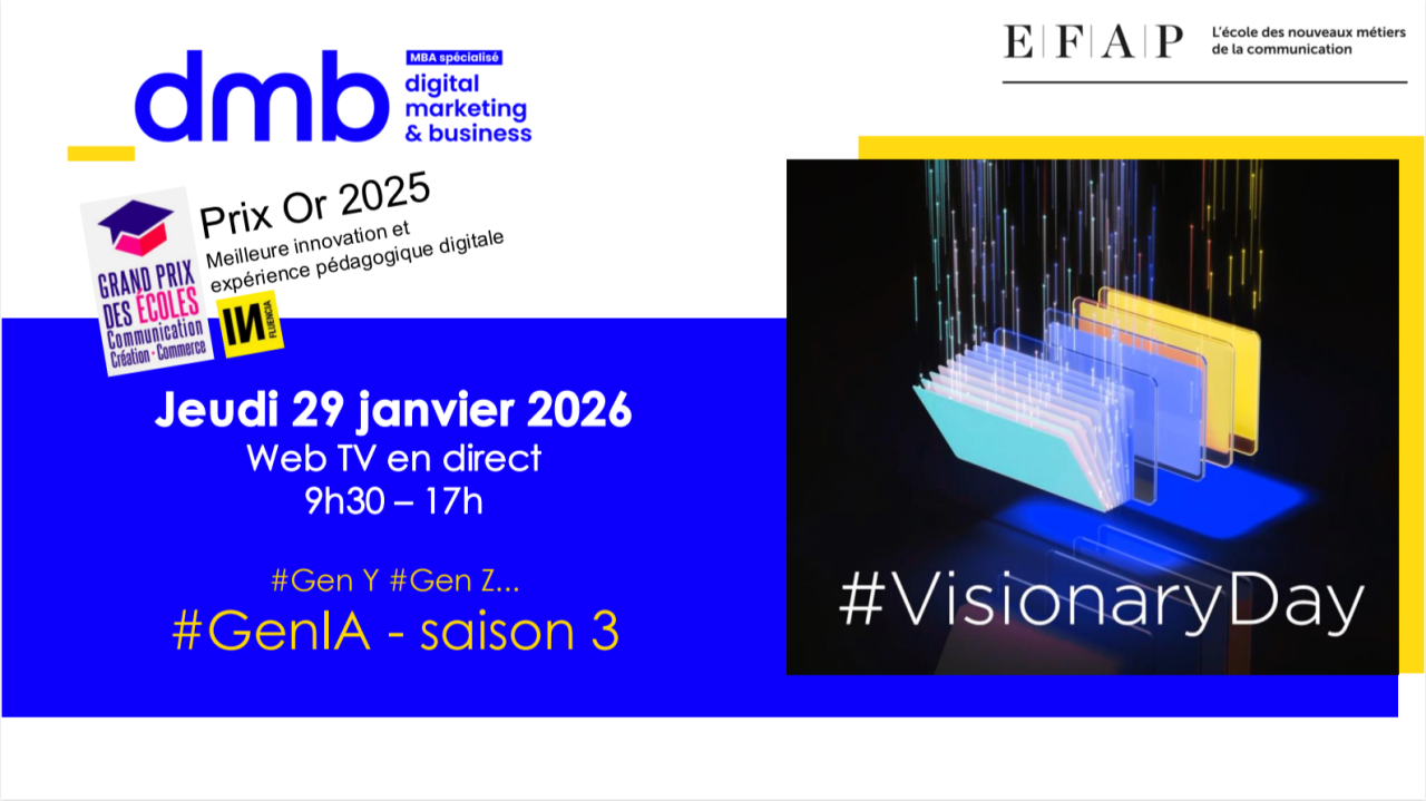 The Visionary Day, a flagship event of the MBA Specialized in Digital Marketing & Business at EFAP, took place on January 29th in a dynamic and immersive atmosphere! During this ninth edition, a 7-hour live community WebTV allowed the exploration of the central role of artificial intelligence (AI) in the evolution of professions and professional practices, opening new perspectives for EFAP students.